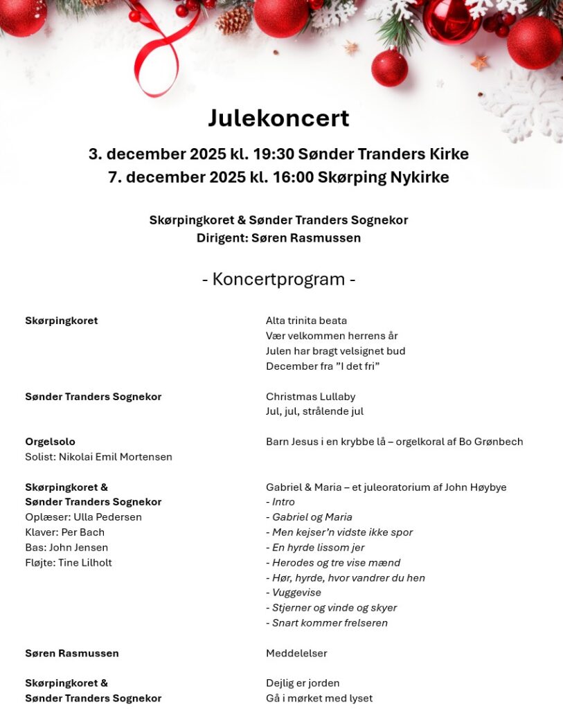 Julekoncerten blev opført i Sønder Tranders kirke onsdag den 3. december 2025 og som traditionen forskriver, i Skørping Nykirke, søndag den 7. december kl. 16:00. Hovednummeret var “Gabriel og Maria” af John Høybye